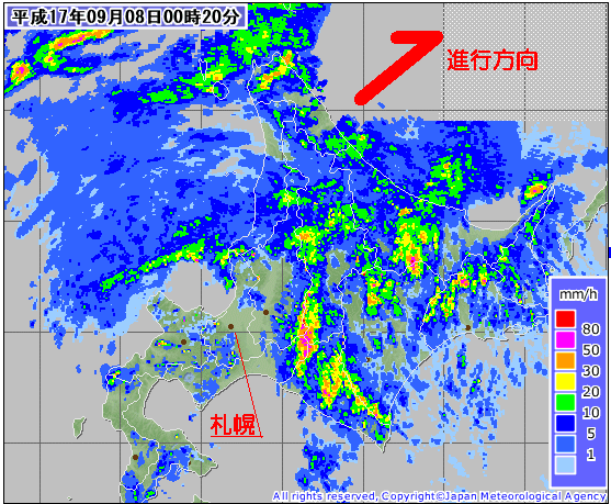 2005/09/08(木)台風14号直撃 2017/10/12 00:18 地元(札幌)・北海道の話題 昨日(9/7) の 23:30頃、せたな町付近に再上陸し、札幌付近通過の見込み。 現在(9/8 00:35 現在)、風が多少強いですが、雨は小降りです。 台風本体の雨雲は既に北部や東部へ抜けているので、札幌付近では豪雨ということはなさそうですが、 旭川、稚内、紋別、網走、帯広、釧路といった方面はかなりの雨になりそうです。 〔気象庁 降水レーダナウキャスト〕